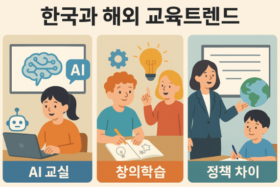 2025년, 전 세계 교육은 ‘AI 교실’, ‘창의학습’, ‘정책 혁신’이라는 세 가지 키워드를 중심으로 빠르게 재편되고 있습니다. 특히 한국과 해외 주요 국가(미국, 핀란드, 일본, 싱가포르 등)의 교육 방향이 뚜렷하게 갈라지고 있는데, 그 차이는 단순한 기술 도입의 속도가 아니라 ‘교육 철학’과 ‘학생 중심성’에서 비롯됩니다. 이번 글에서는 한국과 해외의 2025 교육트렌드를 비교하며, 어떤 점이 다르고 무엇을 배워야 하는지를 심층적으로 살펴보겠습니다.